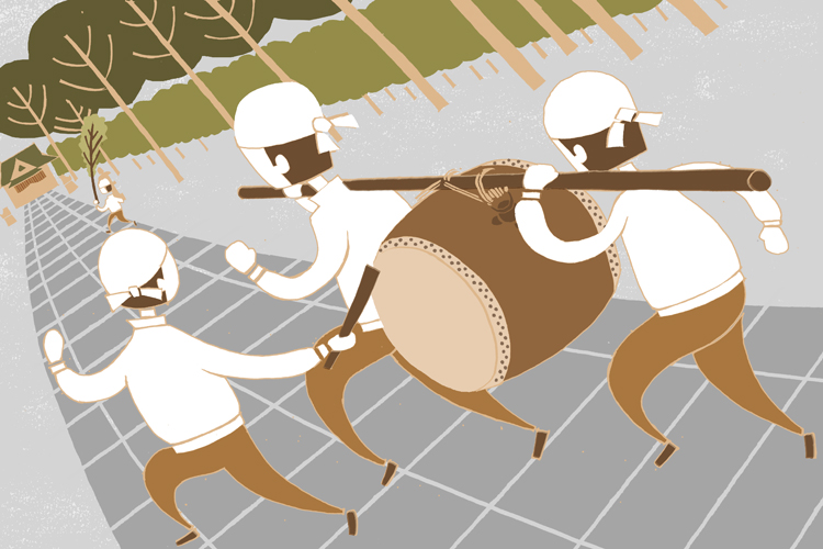 しめ飾りをした大榊を担ぐ氏子さんが石畳の参道を走り、それにあわせ、大太鼓を担いだ氏子さんたちが、これもまた走りながら、太鼓を打ち鳴らす。家内安全と五穀豊穣を祈る太鼓の音が、厳かに境内に響き渡り、新しい年の幕開けを告げます。