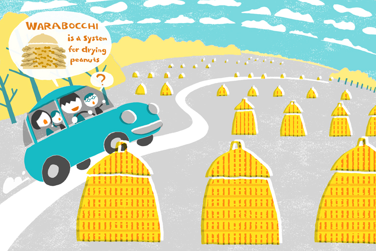地中で実る落花生は、収穫後すぐに土から離して乾燥させなければ風味が落ちるため、この天日干しの工程が行われてきました。落花生の株が空気を均等に含むよう工夫されたわらぼっちは、先人の知恵の結晶。数日から一週間ほど自然乾燥させることで、芳ばしさが増し、深い甘みが生まれるのだそうです。